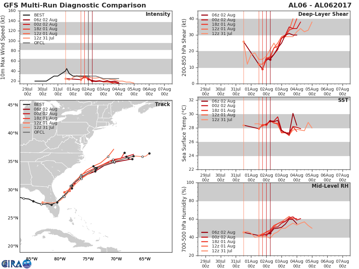 GFS Diagnostic Verification - Intensity, 850-200 mb Shear, Sea Surface Temperature, and 700-500 mb Relative Humidity