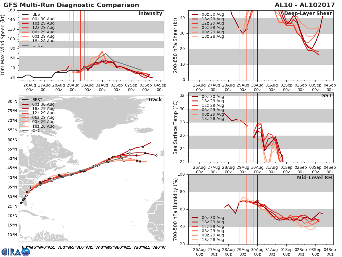 GFS Diagnostic Verification - Intensity, 850-200 mb Shear, Sea Surface Temperature, and 700-500 mb Relative Humidity