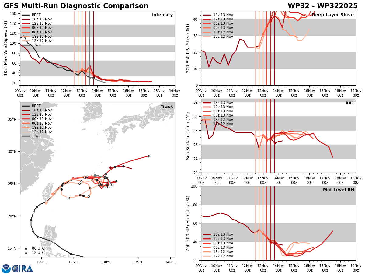 GFS Diagnostic Verification - Intensity, 850-200 mb Shear, Sea Surface Temperature, and 700-500 mb Relative Humidity